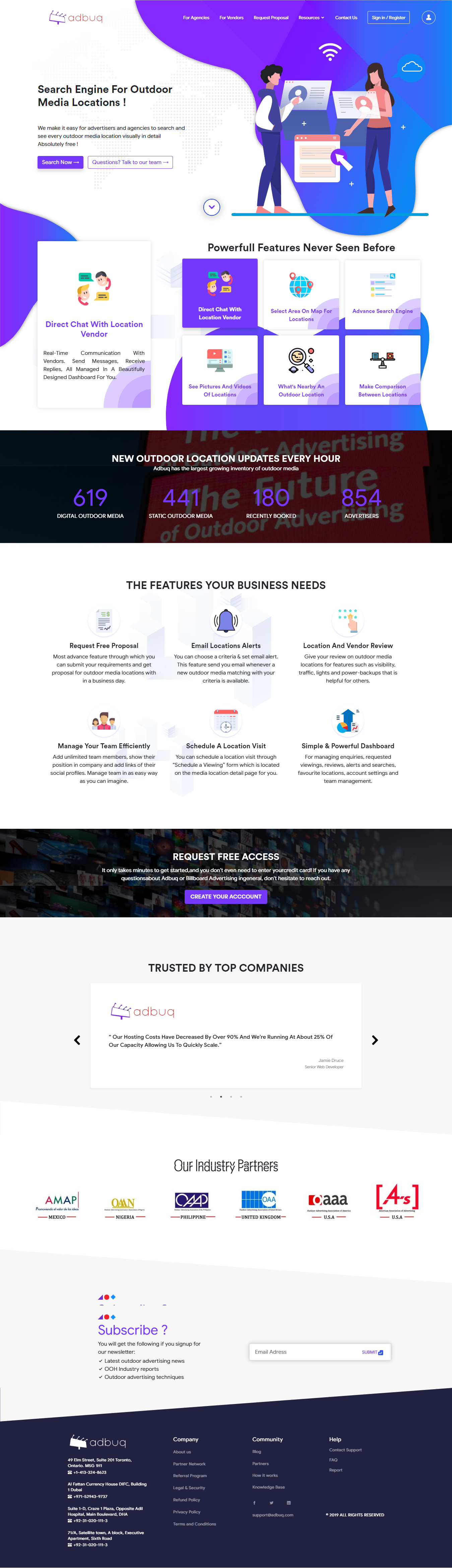 ADBUQ is an outdoor media marketplace where advertisers discover, compare, and book billboards and OOH media locations. The platform features advanced search filters, Google Maps integration, photo/video galleries, and side-by-side comparison tools for 5,000+ billboards across Pakistan, Canada, and UAE.